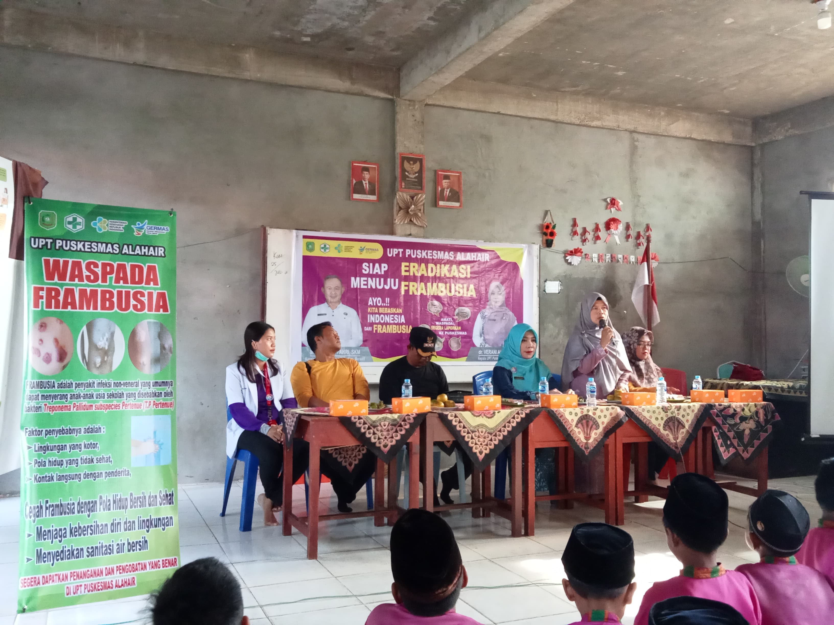 Rangkaian kegiatan dimulai dengan sosialisasi frambusia, PHBS, dan kantin sehat. Sosialisasi frambusia dijelaskan oleh Dr. Emilia. Frambusia adalah jenis penyakit kulit menular menahun yang kambuhan, disebabkan oleh kuman Treponema pertenue. Gejala awalnya berupa benjolan kecil-kecil di kulit yang tidak sakit dengan permukaan basah tanpa nanah. Penyakit ini merupakan suatu infeksi bakteri jangka panjang (kronis) yang paling sering mengenai kulit, tulang, dan sendi.